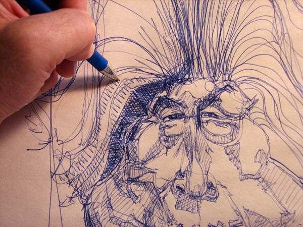In the following picture, I've done a pretty rapid fire drawing of the hand (lots of foreshortening in the hand - and if you don't understand "foreshortening", search it out in your source book (type "foreshortening" into the "find" function and you'll get tons of references)...oops! I just realized the next picture is the original caricature. Fooled myself. Well, your job is to compare the one above and below: